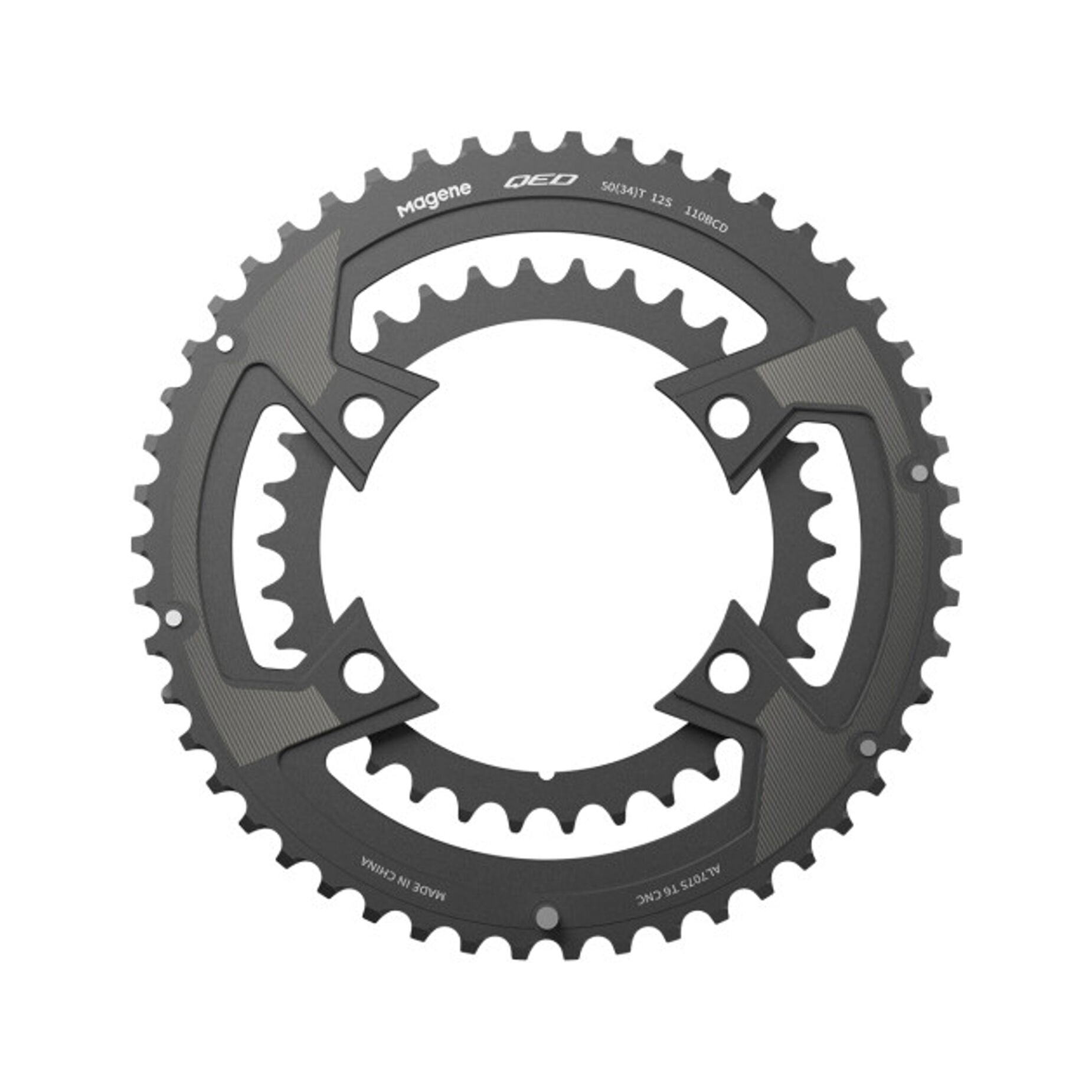 Die Magene QED Lightweight Split-Kettenblätter sind eine Hochleistungslösung für Straßenkurbelgarnituren mit einer 4-Loch-BCD-110-mm-Aufnahme. Entwickelt für LZur Verwendung mit Leistungsmessern und Kurbelgarnituren von Magene (PES515- und P505-Serie) sind diese Kettenblätter ideal für alle, die Steifigkeit, Leichtigkeit und optimale Kompatibilität mit modernen Shimano- oder SRAM-Gruppen mit 11 und 12 Gängen suchen.